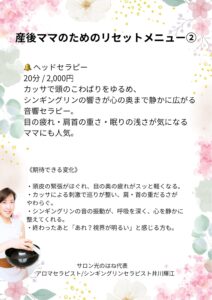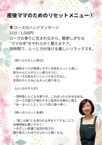 産後ケアのリラクゼーションメニューに、ハンドマッサージとヘッドセラピー&音響セラピーが加わりました。