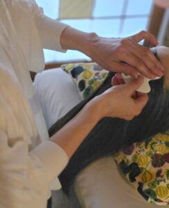 ヘッドは、カッサを使って凝り固まった頭皮を緩め、その後りんの音でリラックスしていただく約30分のリラクゼーションコースです。
