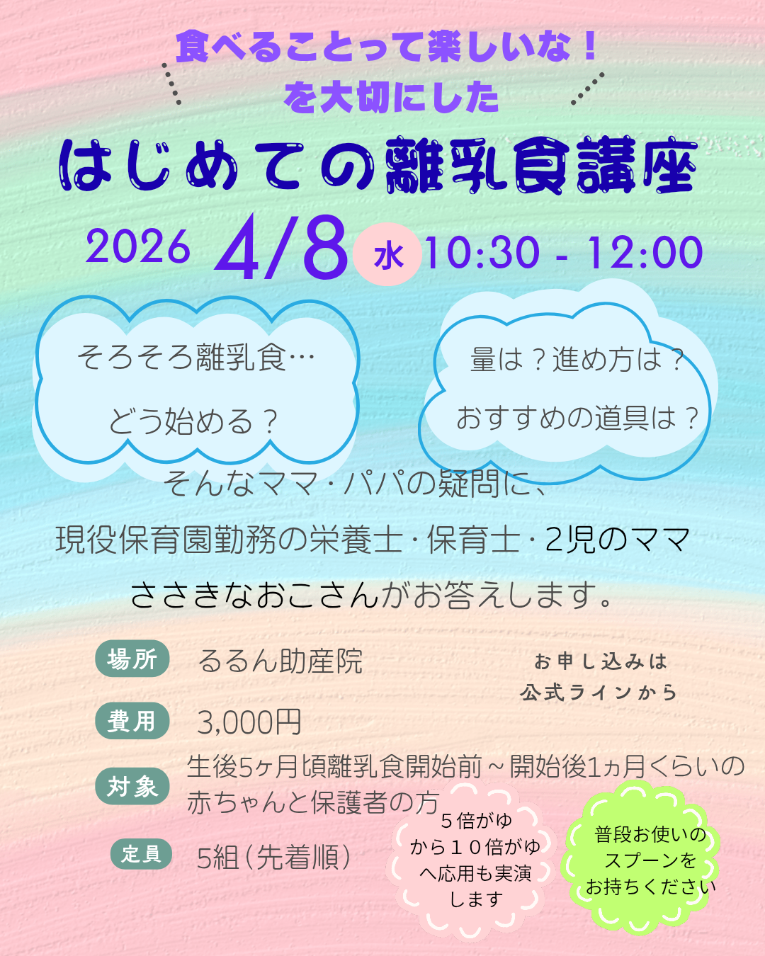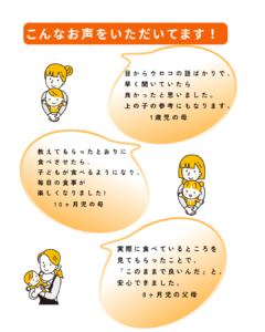 今回の講座は、離乳食をそろそろ始める5か月頃~開始1か月くらいのお子さんと保護者の方むけです。